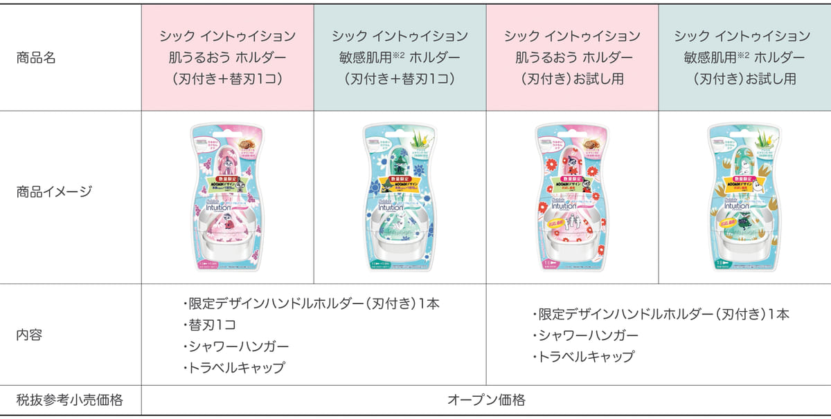 ピンクのハンドルの「シック イントゥイションホルダー 肌うるおう」2種類、グリーンのホルダーの「シック イントゥイションホルダー 敏感肌用」2種類、計4パターンで展開。