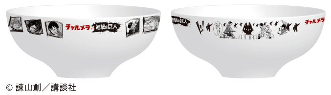 白いどんぶりに『進撃の巨人』の原作コミックの絵柄がプリントされています。