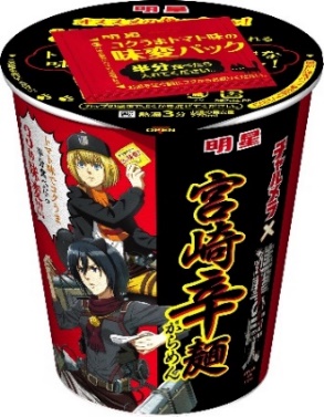 「明星 チャルメラカップ 宮崎辛麺」は、「チャルメラおじさん」が「アルミン・アルレルト」、「くろネコ」が「ミカサ・アッカーマン」になっています。