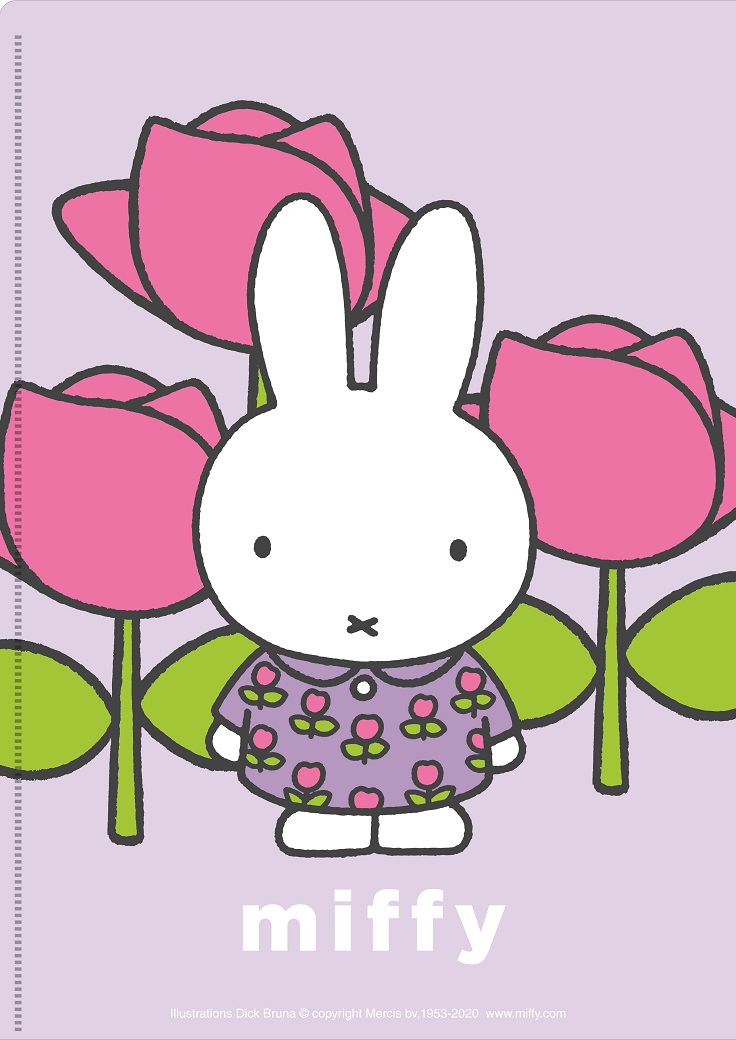バックの花とお揃いの柄のお洋服を着た「ミッフィー」がデザインされた、使い勝手の良いWポケットのクリアファイルです。