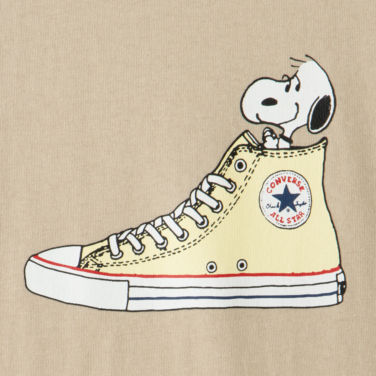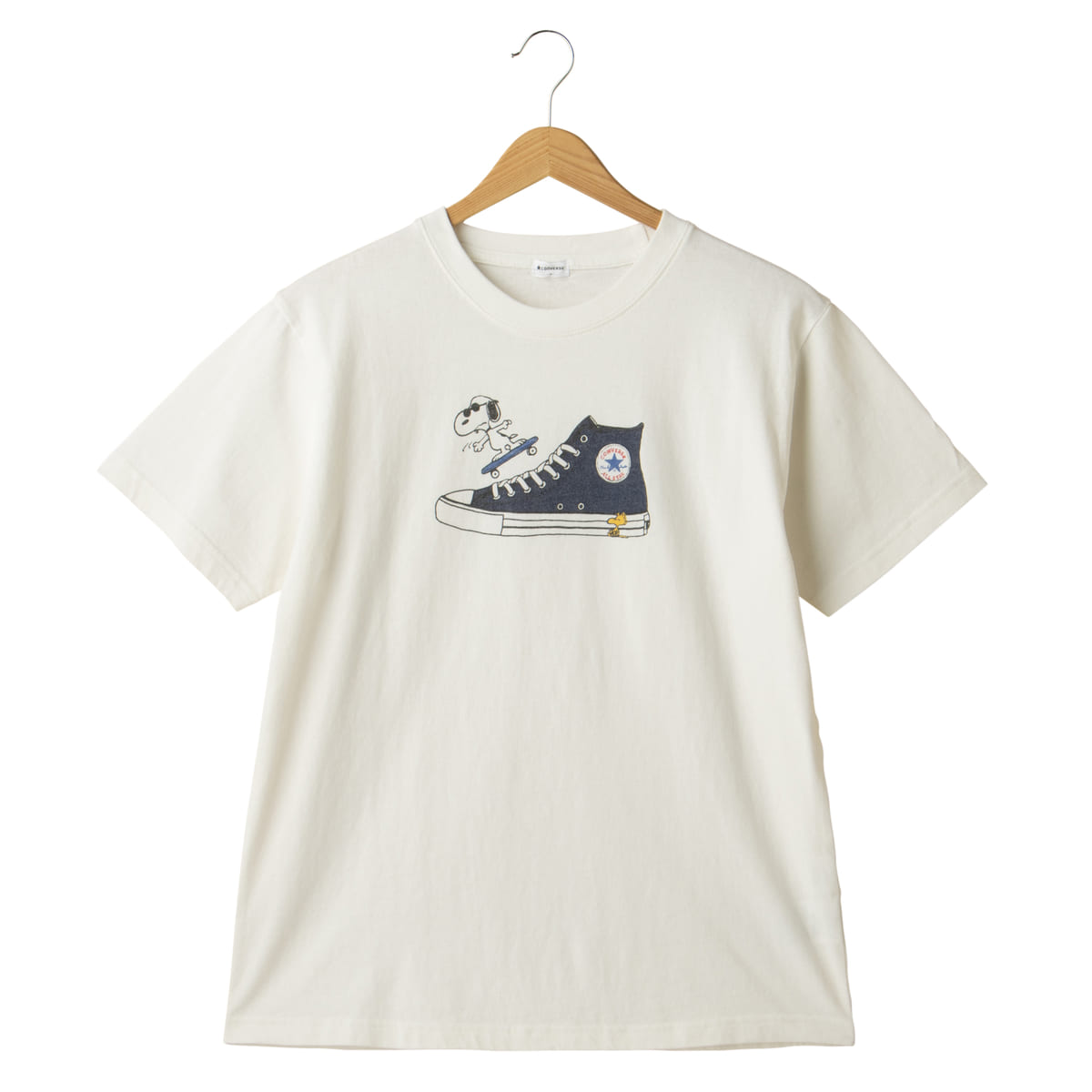この企画のためだけに描かれた、コンバースのアイコニックなALL STARのハイカットと、「スヌーピー」のオリジナルデザインをTシャツにオン!