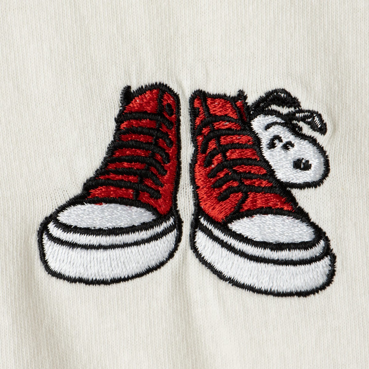 刺しゅうは、レッドのALL STAR ハイカットのサイドから「スヌーピー」が顔を覗かせているモチーフがデザインとなっています。