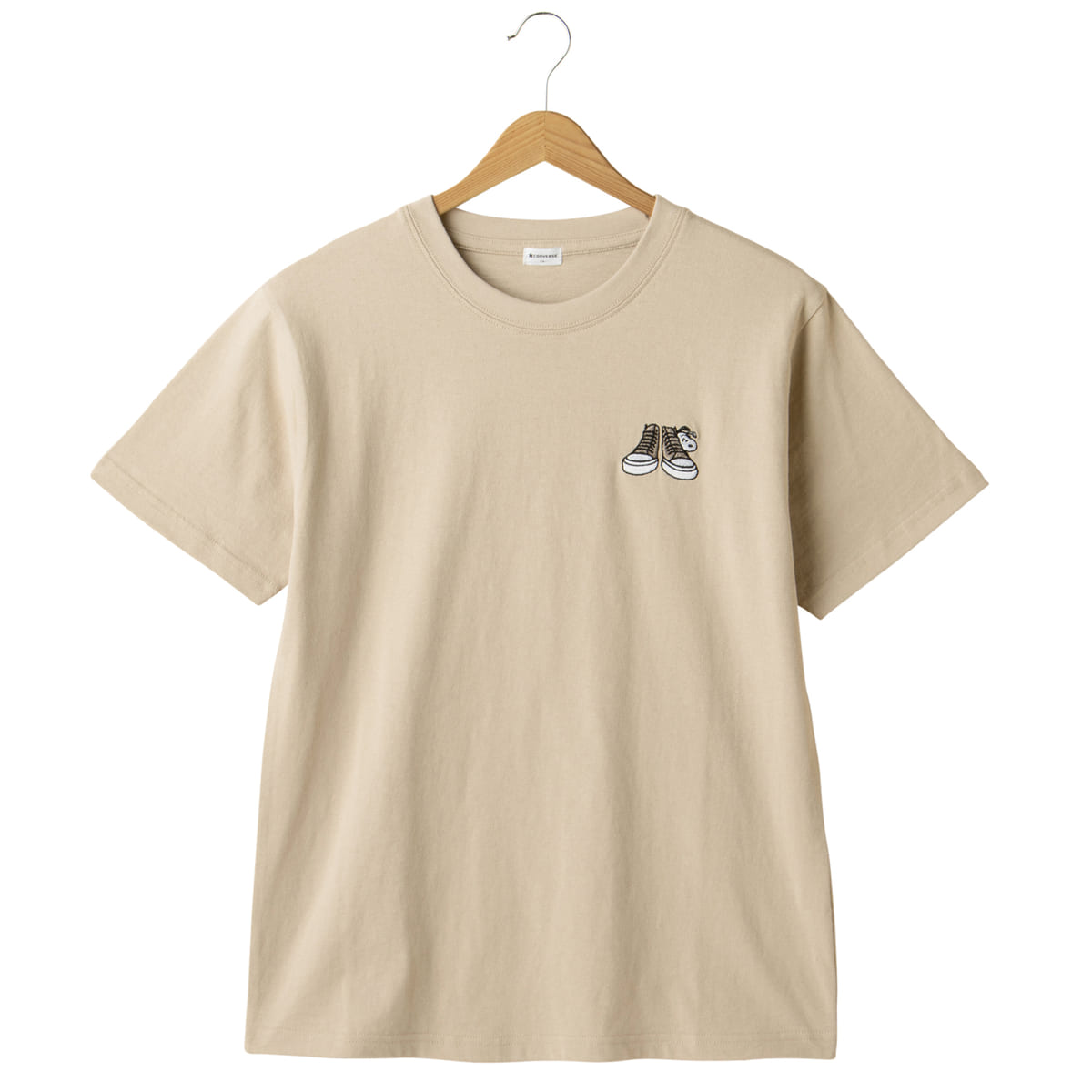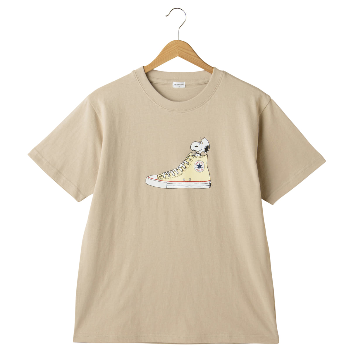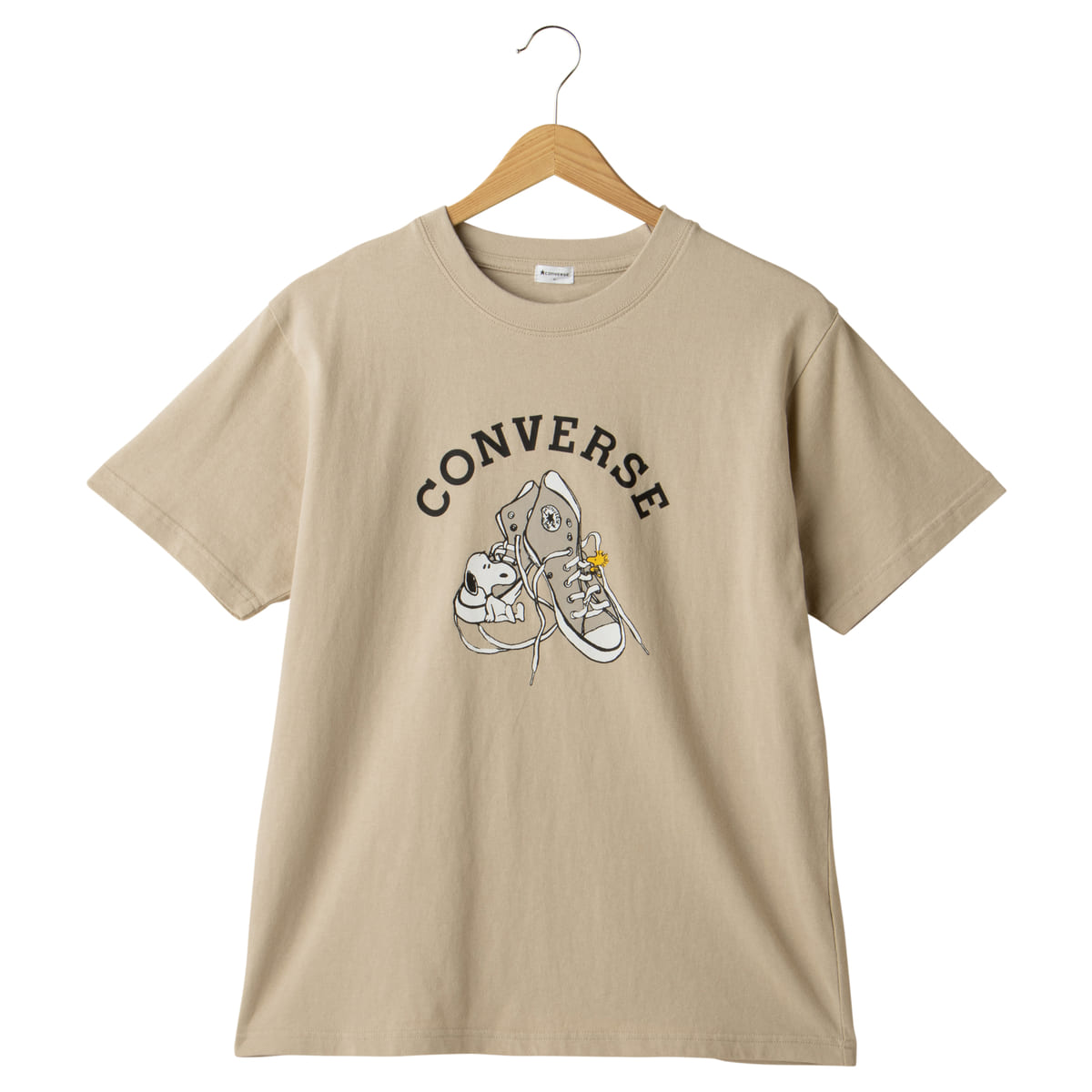 大人可愛いベージュTにワンポイント刺しゅうをあしらったピーナッツ×コンバースコラボTシャツ。