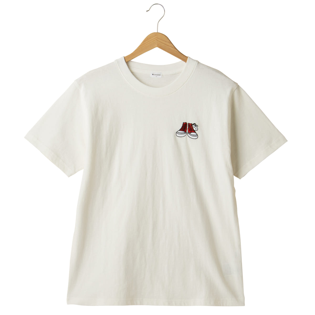 白Tにワンポイントの刺しゅうを施したピーナッツ×コンバースコラボTシャツ。