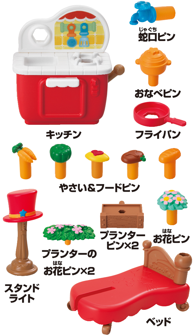 同梱内容:キッチン×1、蛇口ピン×1、ベッド×1、スタンドライト×1、お花ピン×1、おなべピン×1、フライパン×1、にんじんピン×1、かぼちゃピン×1、パンピン×1、ハンバーグピン×1、オムライスピン×1、プランターピン×2、プランターのお花ピン×2、取扱説明書×1