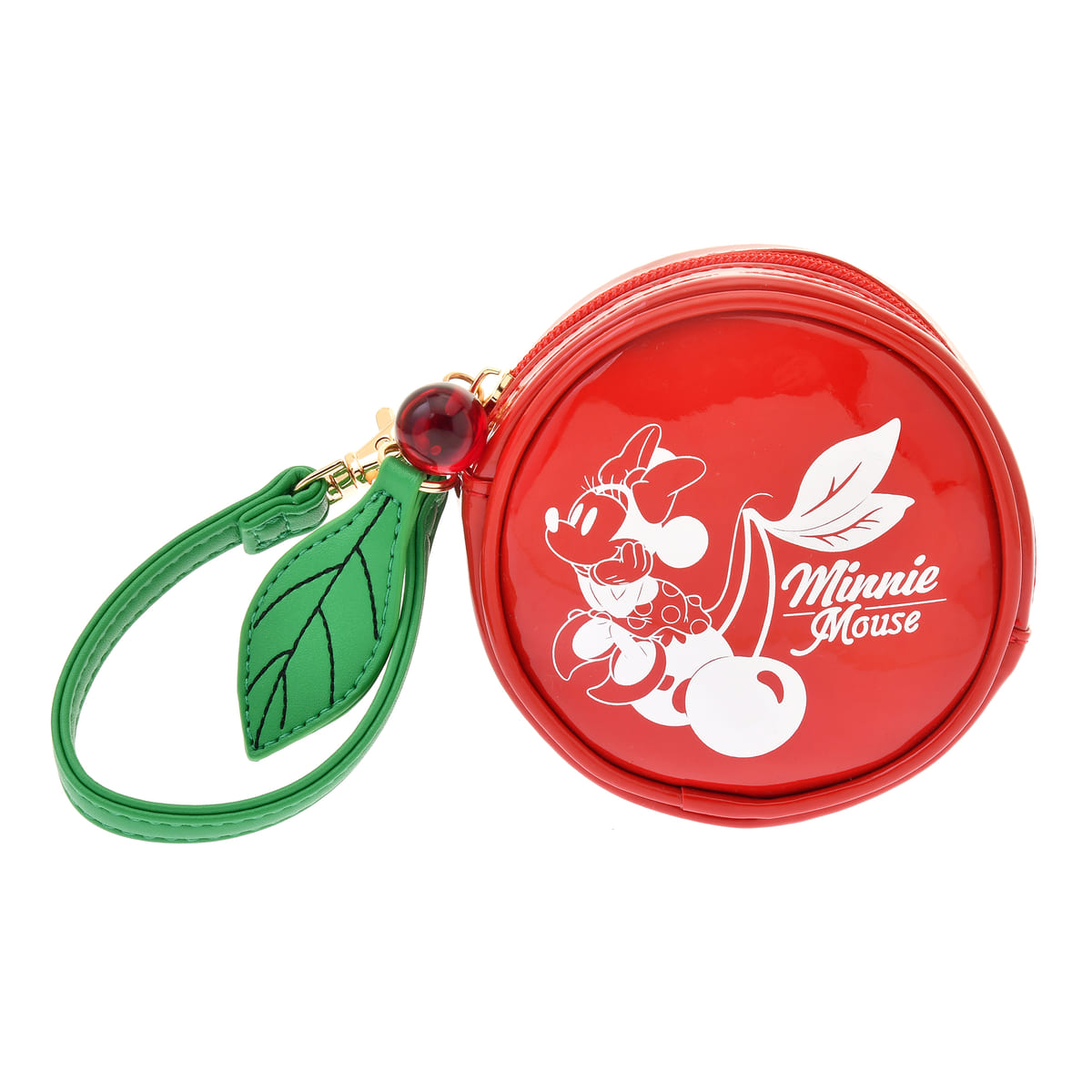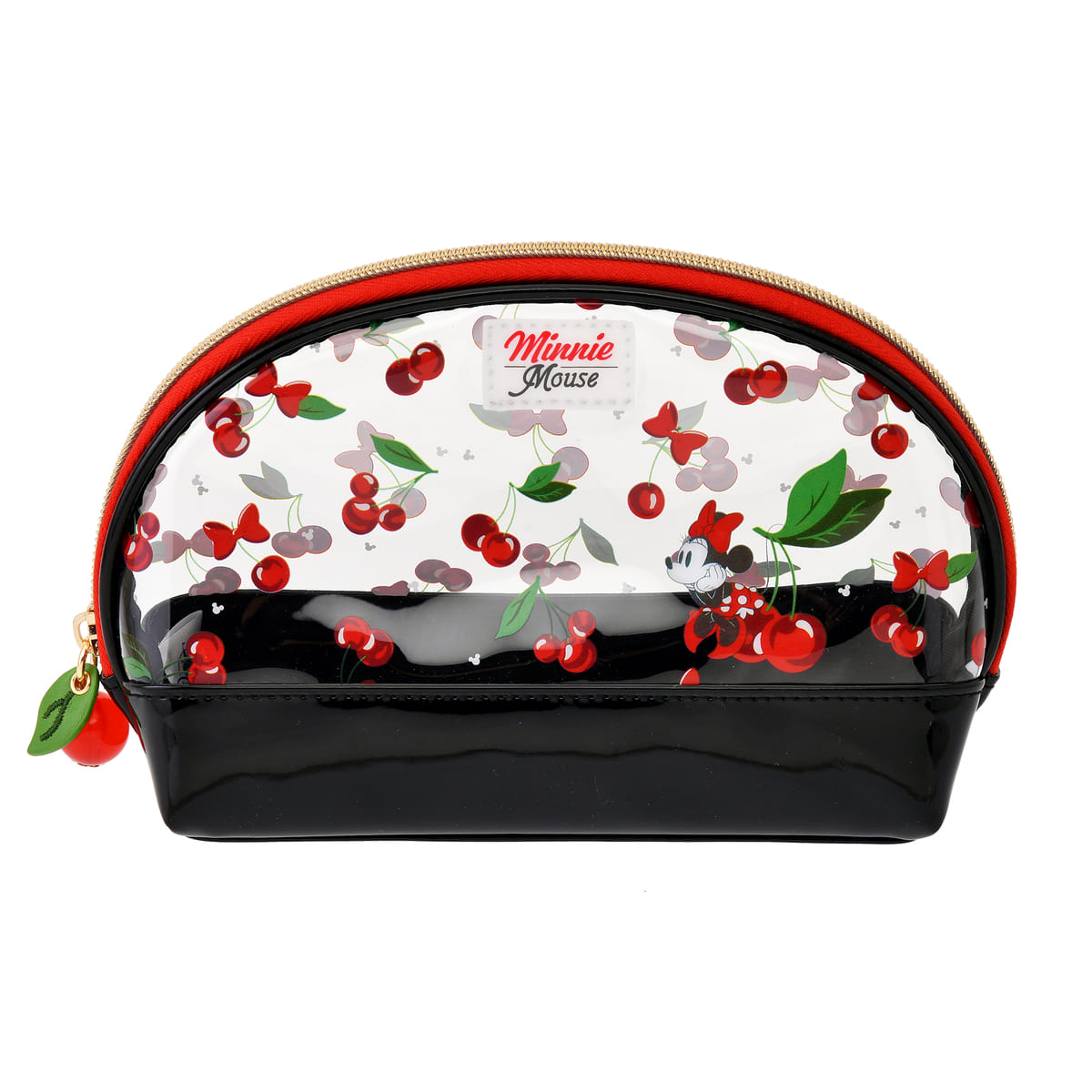 さくらんぼの上に頬杖をつきながらお座りする「ミニーマウス」がプリントされたクリアポーチ。