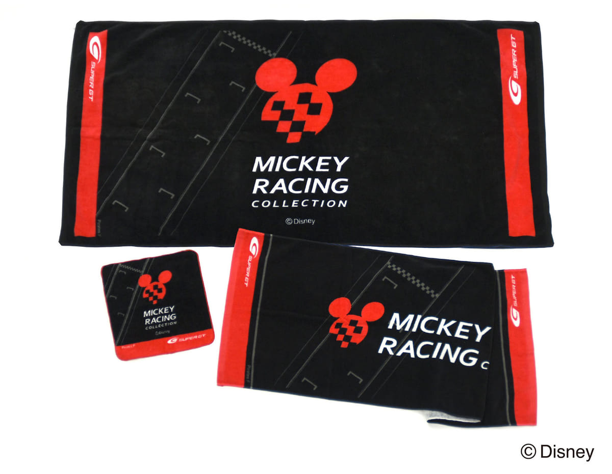 「Mickey Racing Collection」第1弾として、赤と黒を基調としたレーシーなデザインをあしらった、バスタオル、スポーツタオル、ハンドタオル、パーカー、Tシャツ、トートバック、クリアキーホルダー、ステッカーがラインナップ。