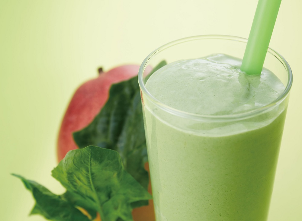 アップルマンゴーとほうれん草、ヨーグルトをミックスした、グリーンスムージー風ドリンク。