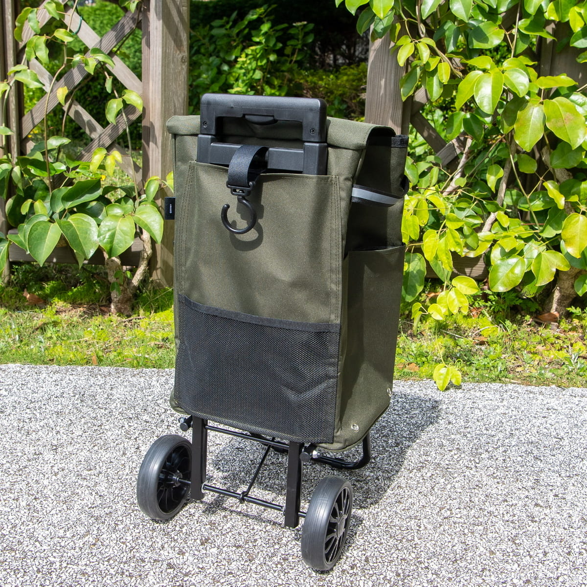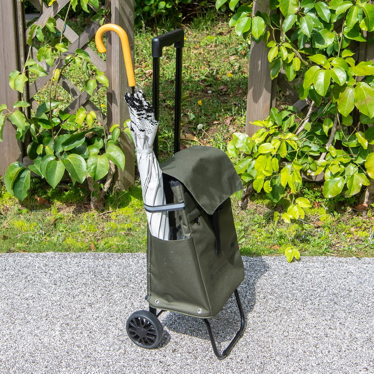 キャリーバッグのように伸縮するハンドルと車輪のついた、折畳み可能なお買い物カート。