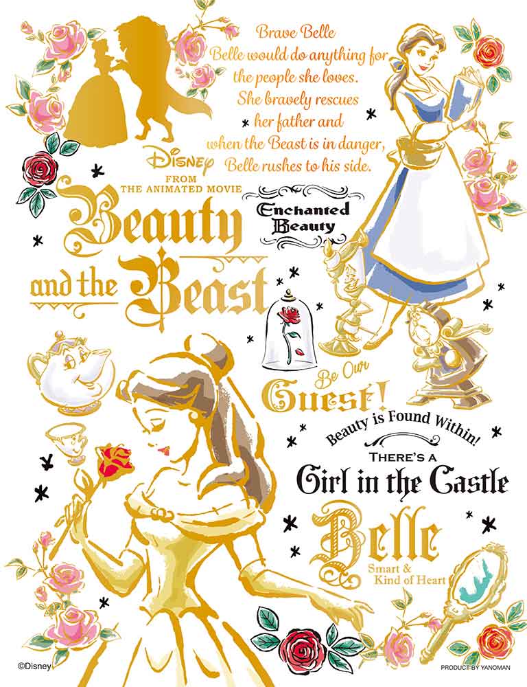 ディズニープリンセスの「ベル」は、ダンスシーンの華やかなドレス姿と町娘のワンピース姿のイラストの2種を配置。