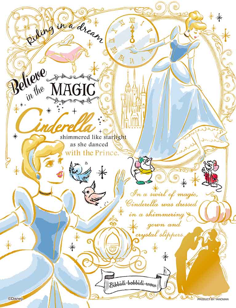 12時を告げる時計、かぼちゃの馬車、ガラスの靴など、『シンデレラ』の物語に欠かせないモチーフや、「シンデレラ」の手の甲にキスをする「プリンス・チャーミング」のシルエットイラストなども煌びやかに表現されています。