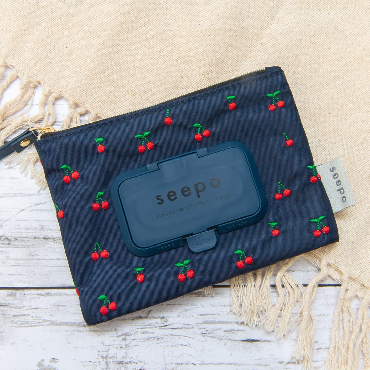 ネイビーの生地にさくらんぼの刺繍が映える「seepo PUSH 刺繍ミニ さくらんぼ」
