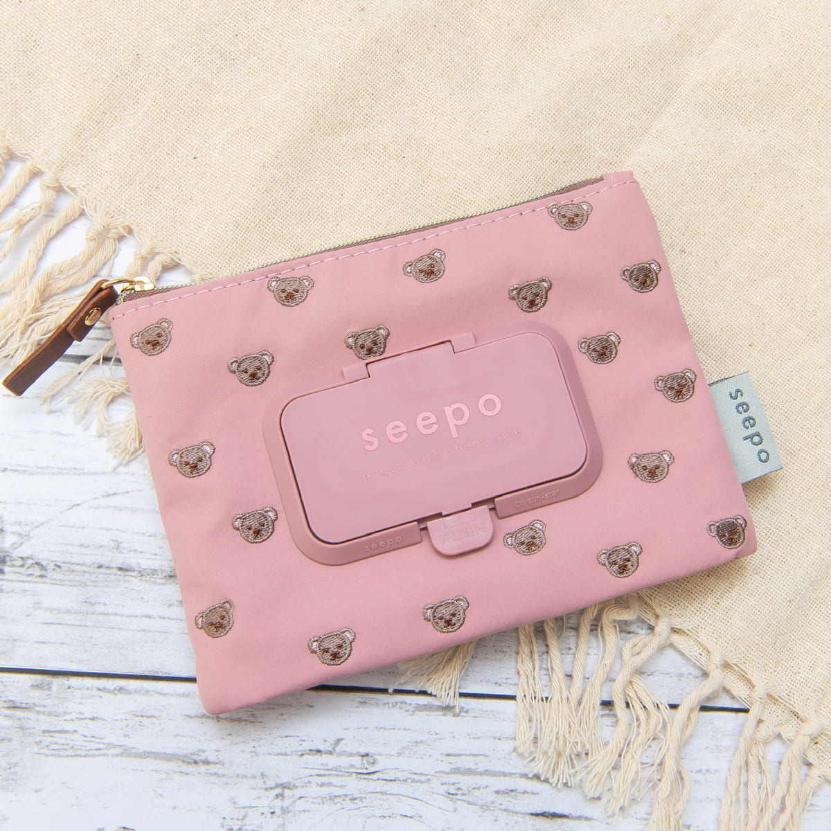 ピンクの生地に散りばめられたクマが可愛い「seepo PUSH 刺繍ミニ クマ」