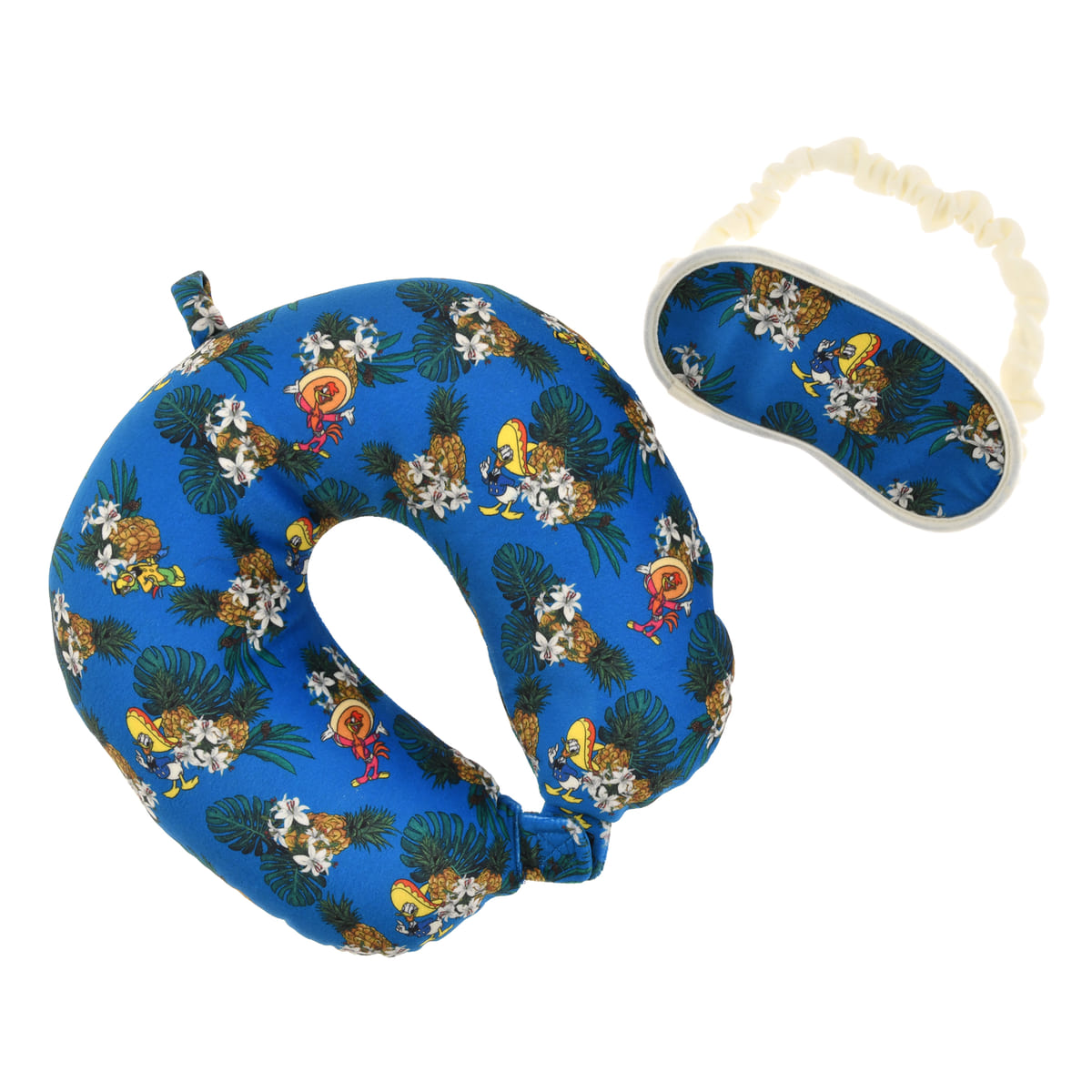 パイナップルや白いお花に陽気なアートを組み合わせたネックピローとアイマスクのセット。