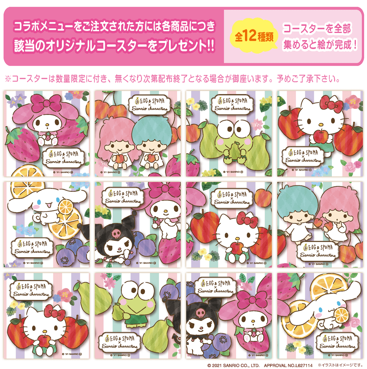「ハローキティ 」「マイメロディ」などが登場する12種類のコースターを全て集めると、一枚の絵が完成!