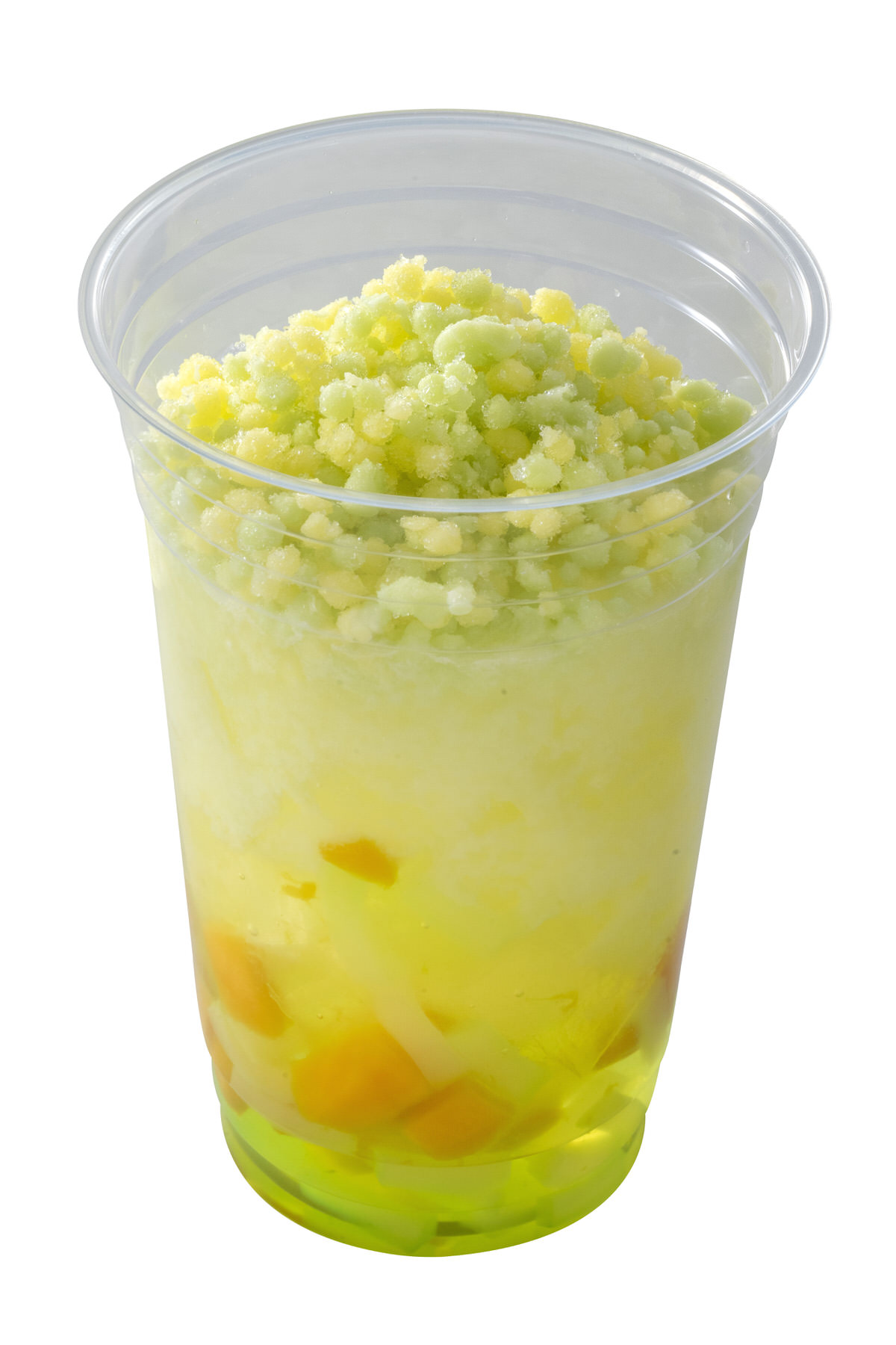 青リンゴのシロップとマンゴーの果肉、ナタデココ、レモンゼリーの食感が楽しめる、オル・メルカラーのドリンクです。