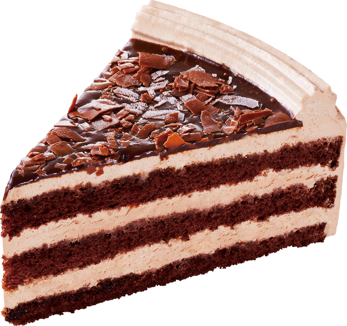チョコレートのホイップとスポンジを層にして、天面に濃厚なチョコレートソースと削ったチョコレートでデコレーションされています。