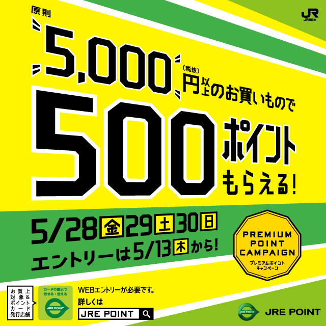 内容:WEBエントリーの上、JRE POINT加盟店(カード提示で貯まる加盟店)にて、期間中合計5,000円(税抜)以上買い物するともれなく、JRE POINTを500ポイントプレゼント