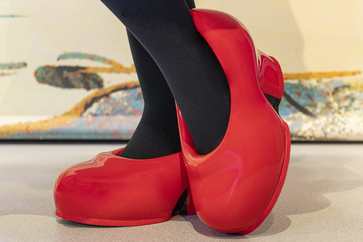 足元は、ビビットな赤のヒールをとり入れ、頭上から足先まで統一感のある配色を取り入れることで全体のトーンをまとめています。