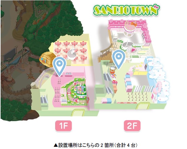 限定デザインのキャッシュレス決済カプセル自販機「スマートガシャポン」は、サンリオタウン1階にあるアトラクション「~マイメロディ&クロミ~マイメロードドライブ」入口付近と、サンリオタウン2階にあるアトラクション「~キキ&ララ~トゥインクリングツアー」出口付近の2箇所に合計4台設置されます。