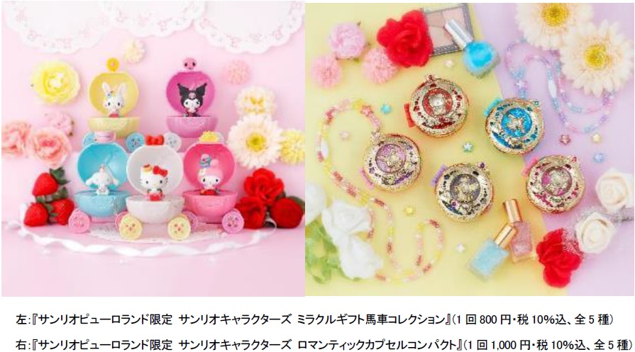 今回設置されるスマートガシャポンは「サンリオピューロランド限定 サンリオキャラクターズ ミラクルギフト馬車コレクション」と「サンリオピューロランド限定 サンリオキャラクターズ ロマンティックカプセルコンパクト」の2つの限定アイテムが登場します。