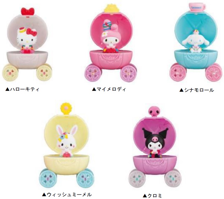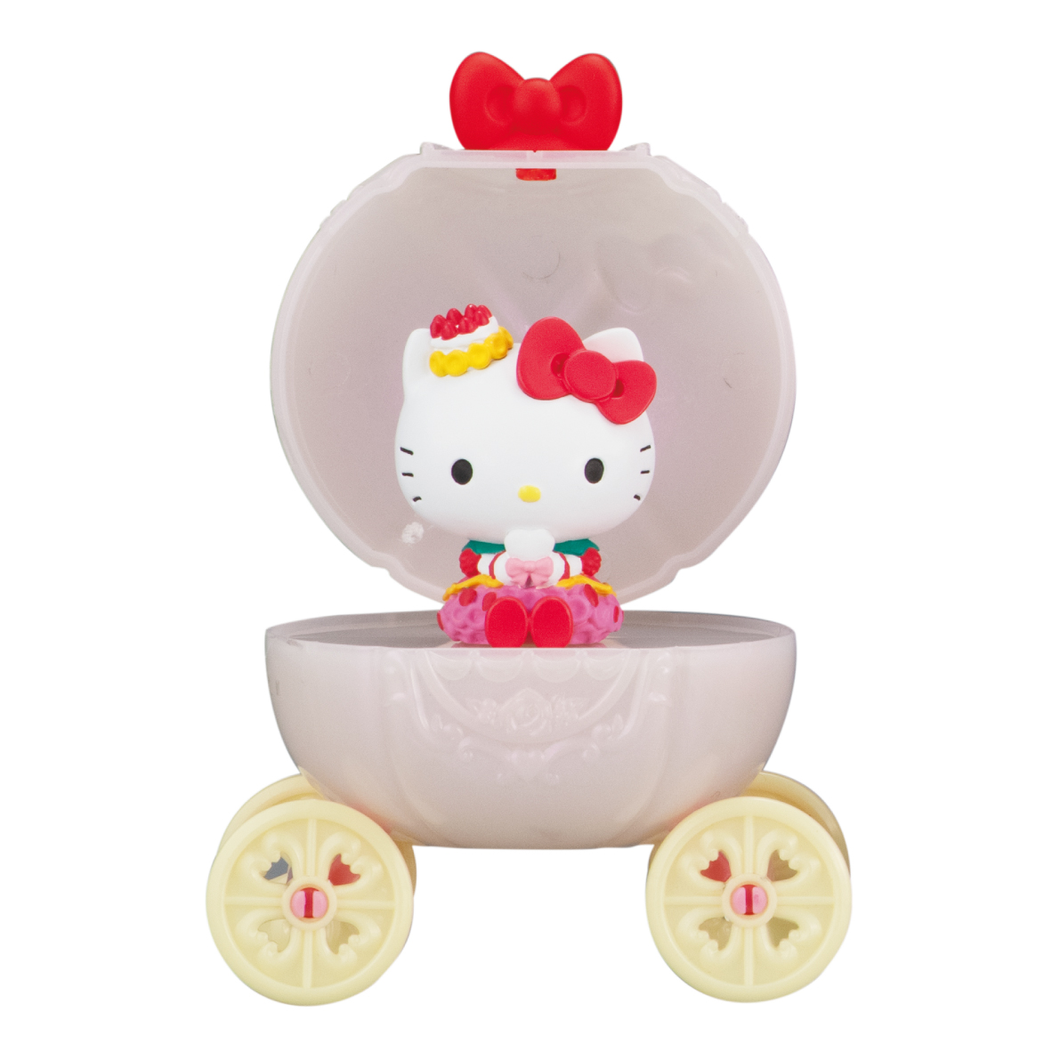 カプセルと中に入っているパーツを組み立てると全高約12cm馬車の形になるコレクションには、フルーティーなドレスに身を包んだ「ハローキティ」や