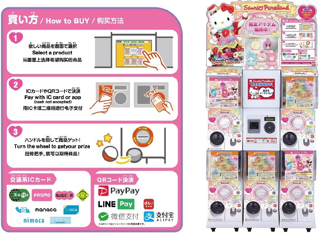 ICカードやQRコードを読み取り機にかざして支払いを行い、購入したい商品が入った自販機のハンドルを回せば、アイテムがゲットできます☆