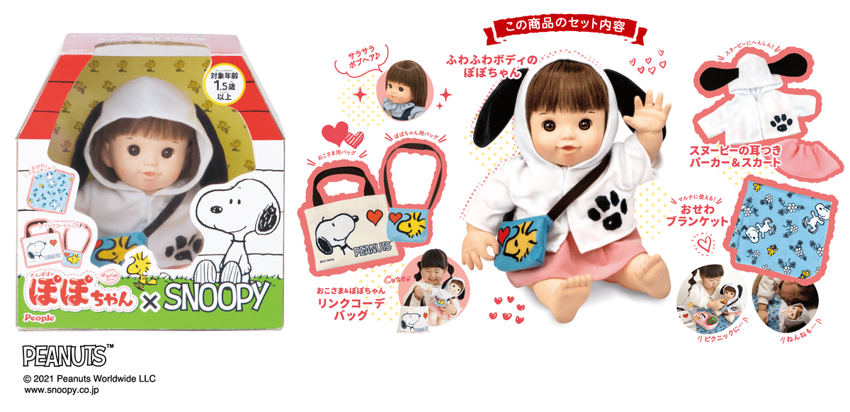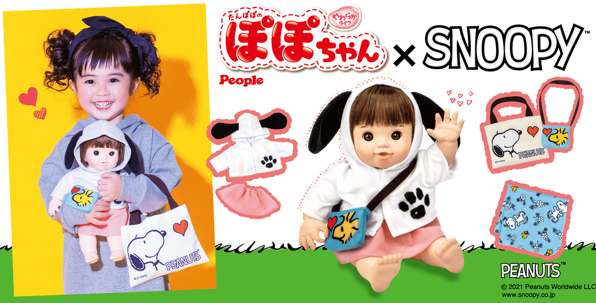 2021年で25周年を迎えたピープルのロングセラーお世話人形「ぽぽちゃん」と、人気キャラクター「SNOOPY」の世界観を表現したお人形&お道具のセット「ぽぽちゃん×SNOOPY」が登場します。