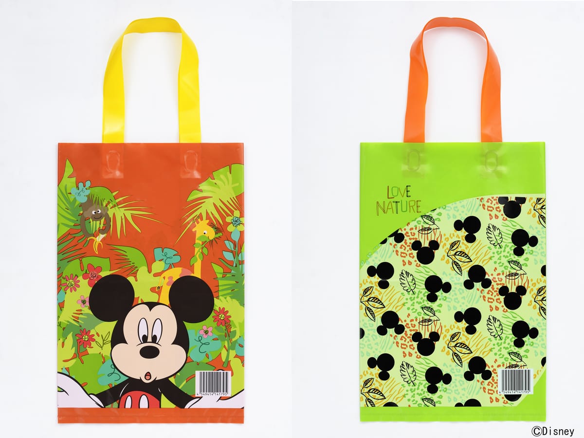 南国テイスト漂う草花や動物たちと共に、驚いた表情を見せる「ミッキーマウス」と、ミッキーモチーフが大胆にプリントされた2種類の買い物袋が展開。
