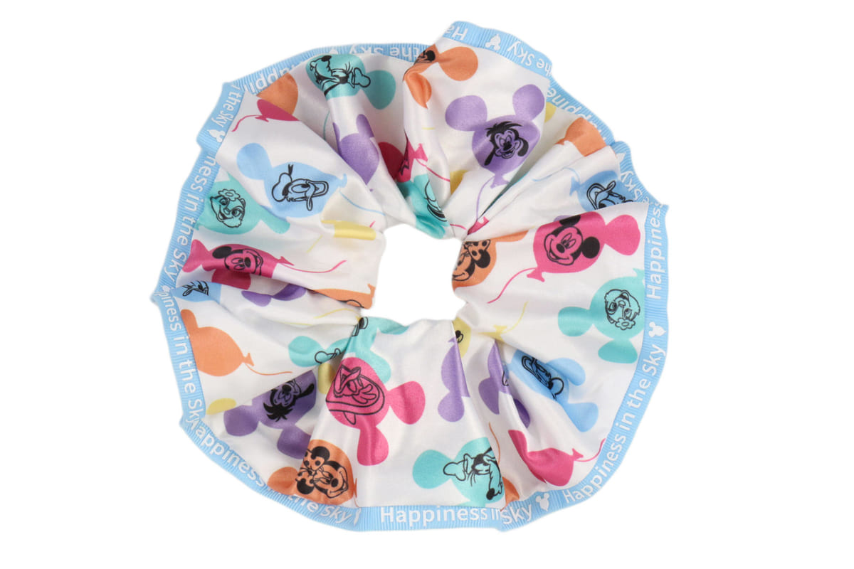 青空のような水色とカラフルなバルーンがポイントのシュシュ。