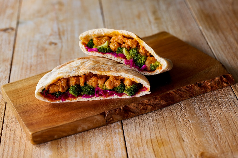 「大豆ミートのピリ辛ピタサンド」は、大豆ミートをごろっと入れることで、本物のお肉のような食べ応えを実現しつつ、夏に向けて食欲そそる、チポトレが効いたピリ辛仕立ての味わいが楽しめます。