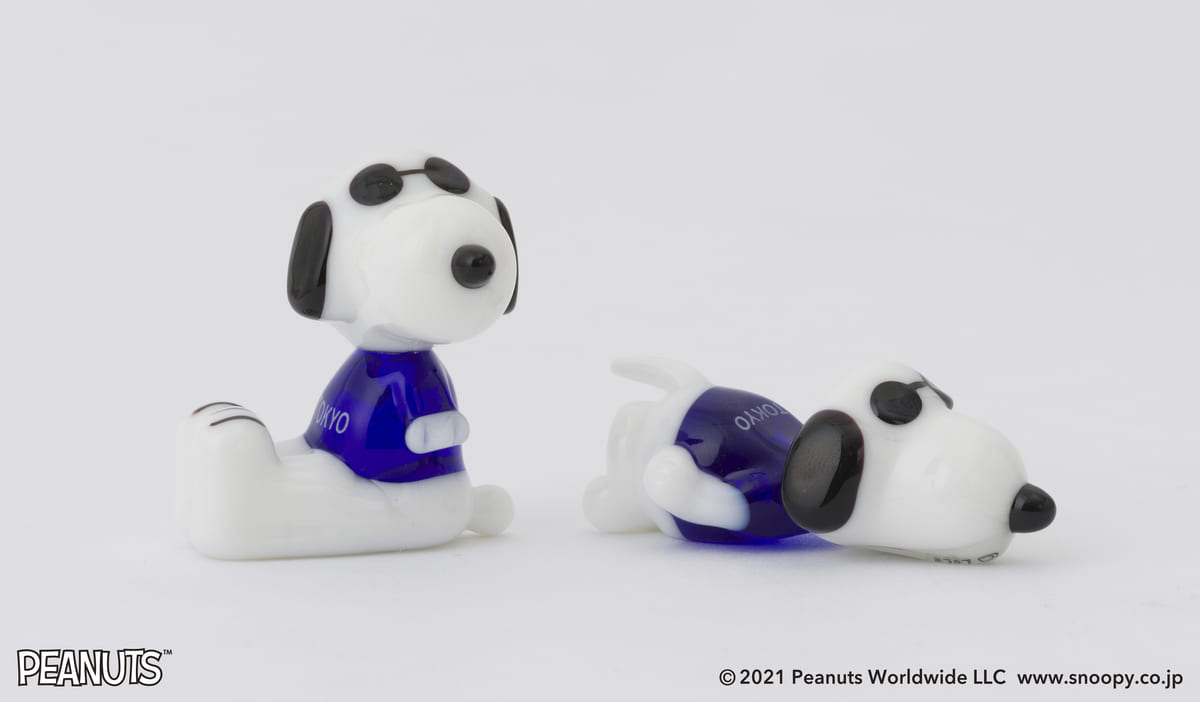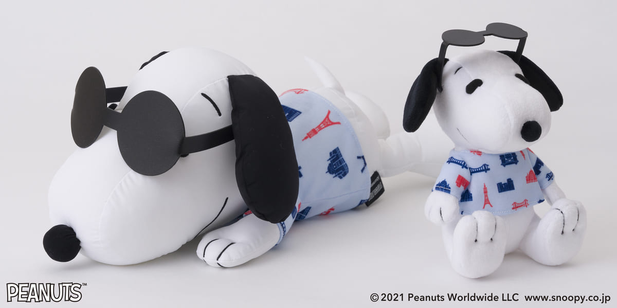 丸いサングラスに東京名所をモチーフにした服を着る「スヌーピー」のぬいぐるみ。