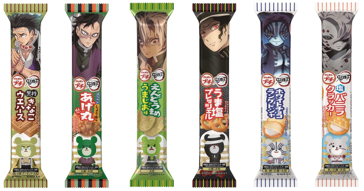 「プチ黒糖きなこウエハース×悲鳴嶼行冥」「プチあげ丸まろやかしょうゆ味×不死川玄弥」「プチえんどうまめうましお味×不死川実弥」「プチうま塩プレッツェル×鬼舞辻󠄀無惨」「プチホワイトチョコラングドシャ×猗窩座」「プチ塩バニラクラッカー×累」の全24種類。