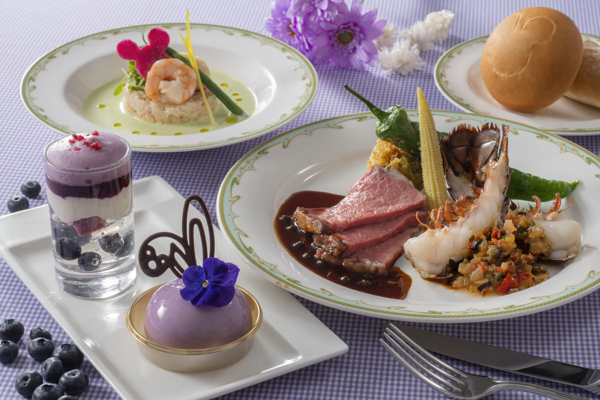 さっぱりとしたフロマージュにほんのりとすみれを香らせたステラ・ルーの耳の形のチョコが目を惹くケーキと、国産のブルーベリーをジュレに閉じ込めた涼しげなヴェリーヌの2種のデザートが楽しめます。