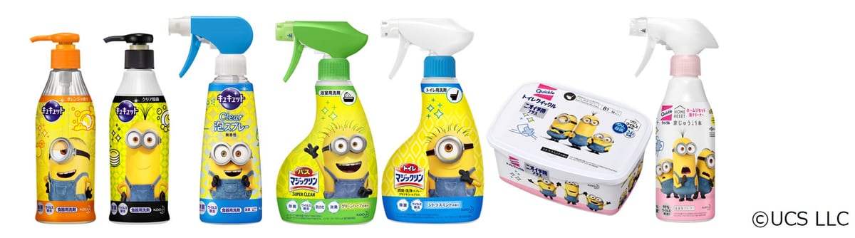 花王から発売されているホームケアブランド「キュキュット」「クイックル」「マジックリン」の全7商品に、バナナが大好きな謎の黄色い生物「ミニオン」の限定デザインが登場!