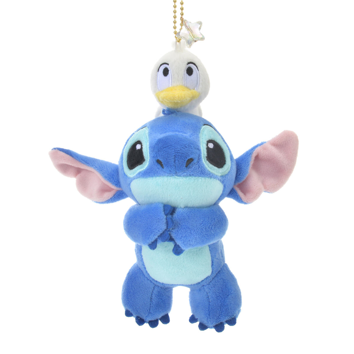 『リロ&スティッチ』シリーズの主人公「スティッチ」と『みにくいアヒルの子』のアヒルのぬいぐるみキーホルダー。