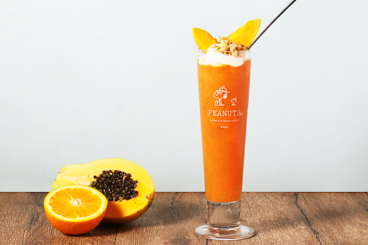 オレンジ、ブラッドオレンジ、ニンジン、バナナ、パパイヤ、パッションソースが入った色鮮やかなフローズンスムージーに、氷の上を滑る「スヌーピー」や「チャーリー・ブラウン」の独特なポーズを思わせるパパイヤをトッピング。