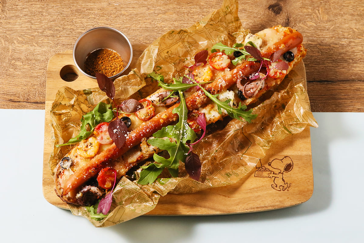 カリカリのバゲットの上には約40cmのロングソーセージ、エビやタコ、イカなどのシーフードも具沢山、賑やかな彩りが食欲をそそります。