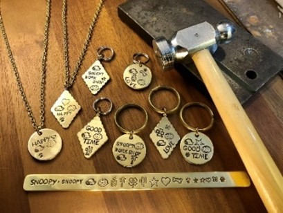 ブラス(真鍮)というゴールドカラーのメタルへ刻印を打刻し、「ネックレス」「キーリング」「ペットタグ」などといった、オリジナルチャームを作るワークショップです。