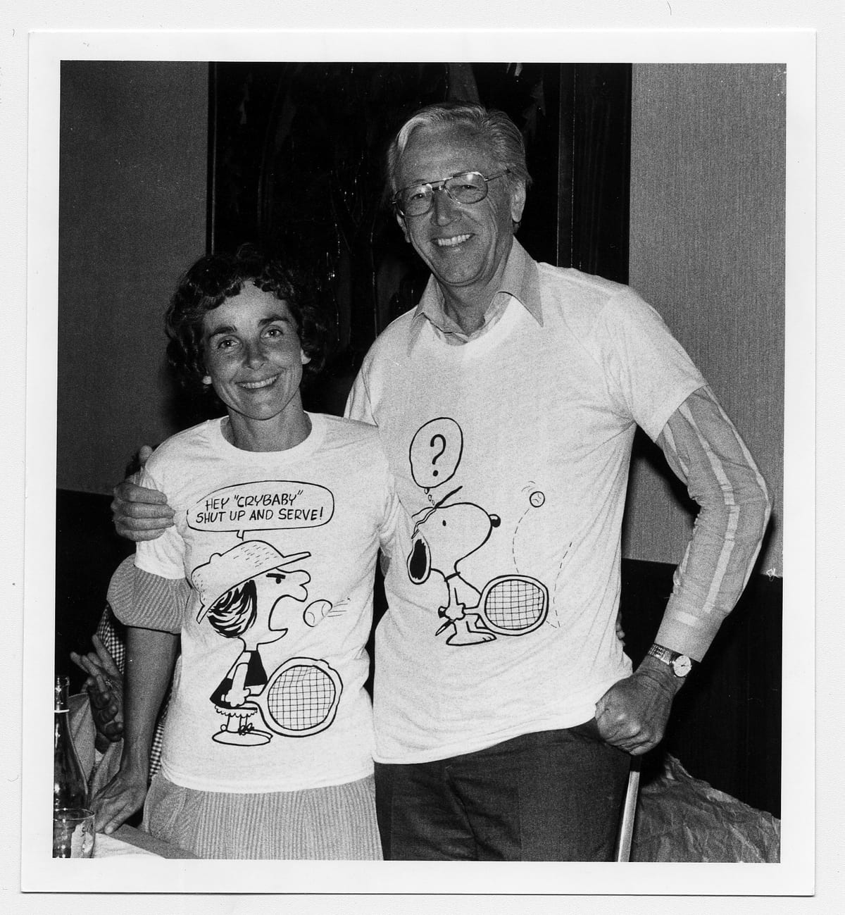 1979年頃に撮影された、テニスのシーンがあしらわれた「ピーナッツ」のTシャツを着るシュルツ夫妻の写真