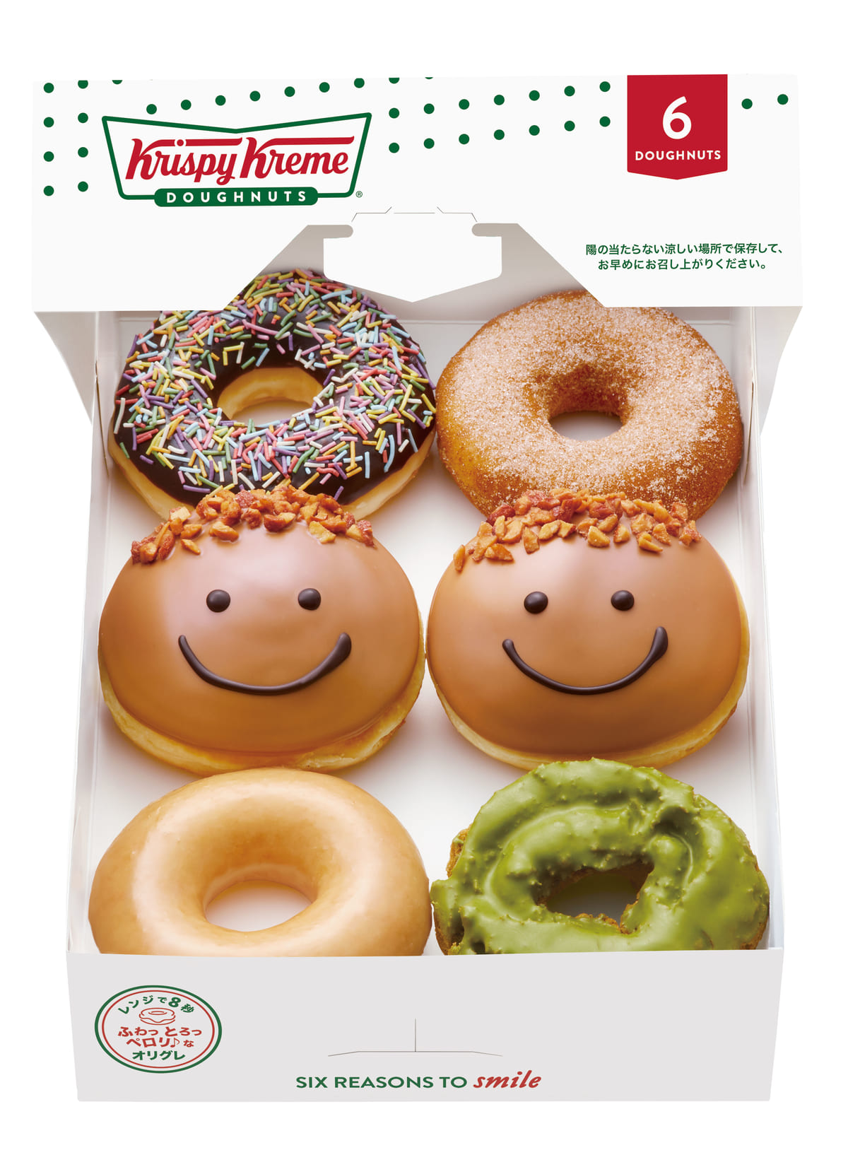 人気No.1の「オリジナル・グレーズド」と、シナモンの風味と香りがクセになる「シナモン シュガー」、宇治抹茶を練りこんだケーキ生地に風味豊かな石臼挽きの抹茶を使った抹茶チョコをコーティングした「オールドファッション 宇治抹茶」や、お子さんにも人気の「チョコ スプリンクル」のドーナツをアソート。