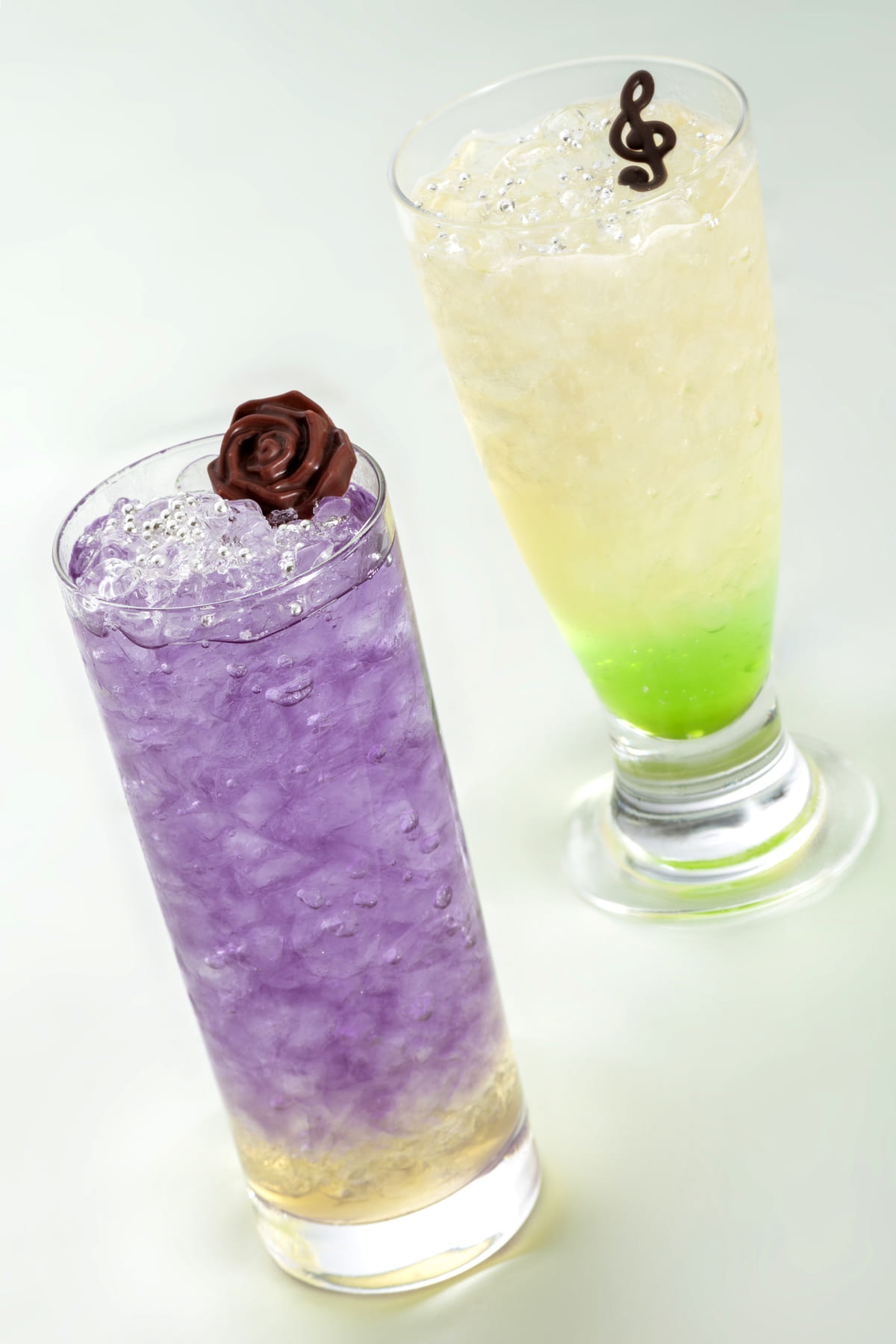 美しい彩りのドリンクに、チョコレートでできたバラをトッピング。