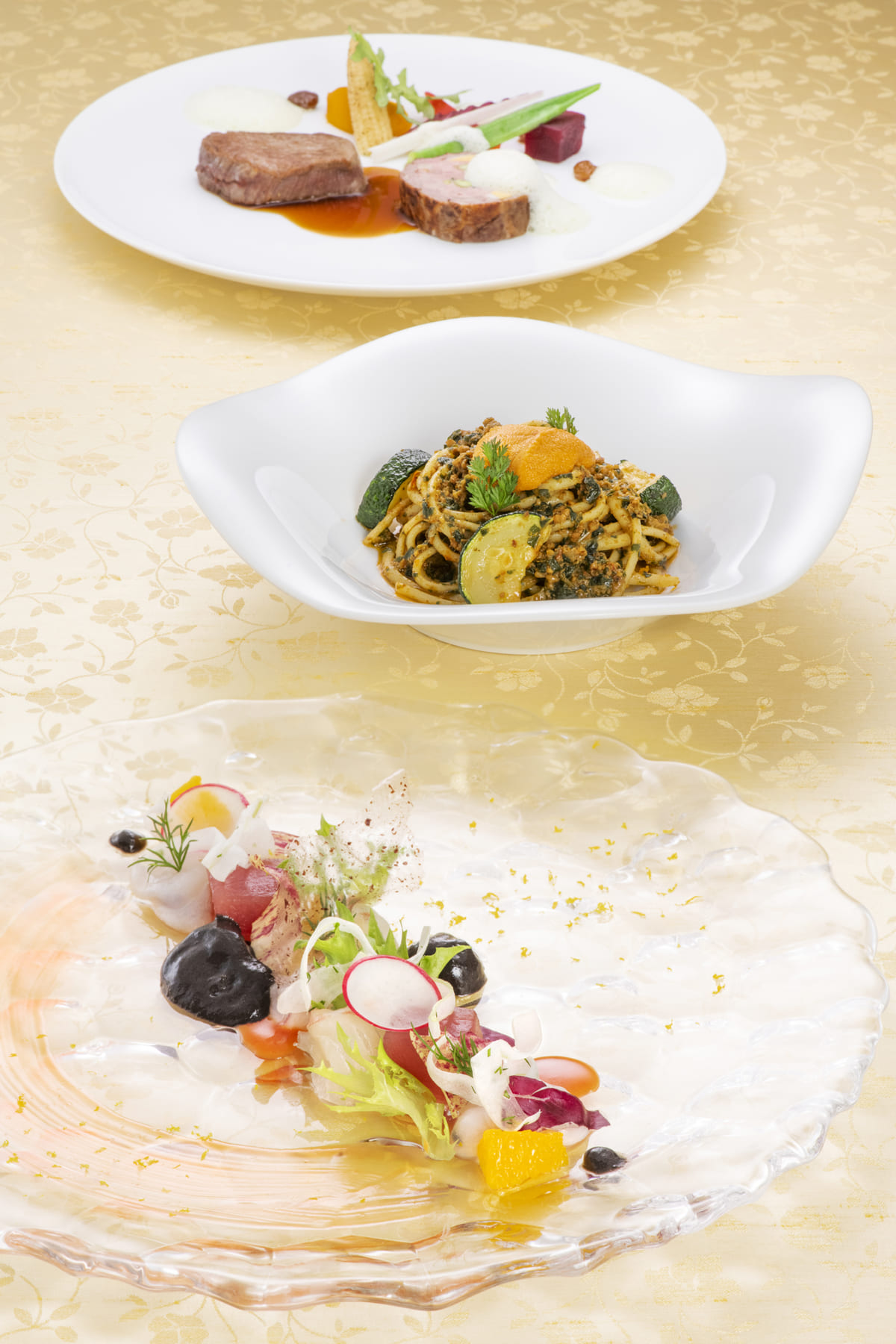 ズッキーニやオクラ、ヤングコーンなど季節の野菜をふんだんに使用した「縞鯵と季節野菜のテリーヌ」や、ルバーブと赤ワインのソースでいただく「牛フィレ肉のグリル」などが楽しめます。