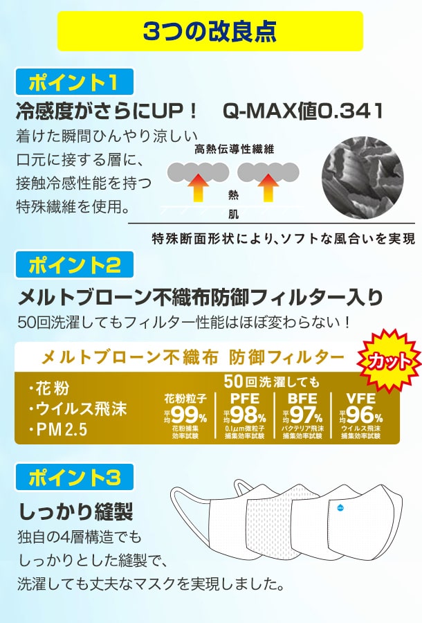 花粉や飛沫対策となる「メルトブローン不織布防御フィルター」は、不衛生タンパク質や花粉などのタンパク質を分解する「ハイドロ銀チタンテクノロジー」を採用。