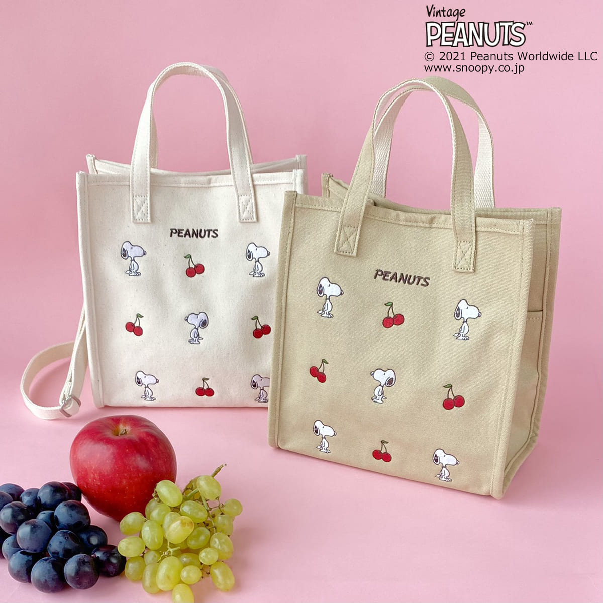 チェリーと「スヌーピー」の刺しゅうが愛らしい「スクエアトートバッグ」
