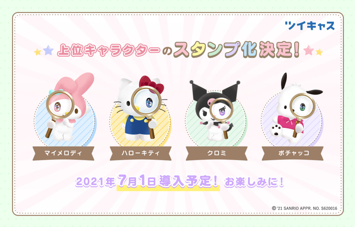 ライブ配信サービス「ツイキャス」内で行っていた、アイテムを使った投票で最もスコアを集めた上位4キャラクター(マイメロディ、ハローキティ、クロミ、ポチャッコ)が2021年7月1日(木)から3ヶ月ごとにツイキャススタンプとして登場します。