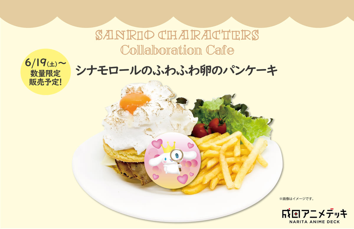 成田国際空港「成田アニメデッキ」にて実施中の、懐かし喫茶のデザインをテーマに、シナモロールをはじめハローキティ・マイメロディのかわいいメニューが盛りだくさんの期間限定コラボカフェにて、シナモロールの『2021年サンリオキャラクター大賞』1位入賞を記念して、新メニュー「シナモロールのふわふわ卵のパンケーキ」を2021年6月19日(土)から数量限定で販売。