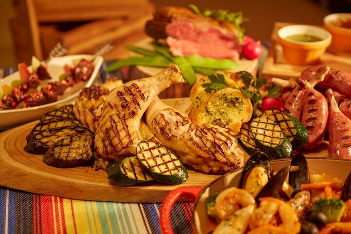 バーベキュー気分で味わえる骨付き鶏もも肉やソーセージ、シーフードアエリアが味わえます。