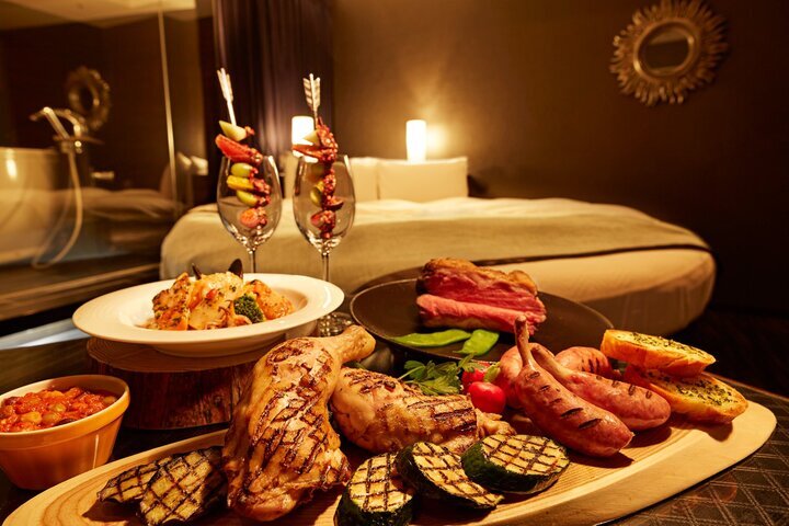 プラネタリウム投影による星空鑑賞に、骨付き肉やパエリアなどの豪華プレートが、お部屋で楽しめます☆