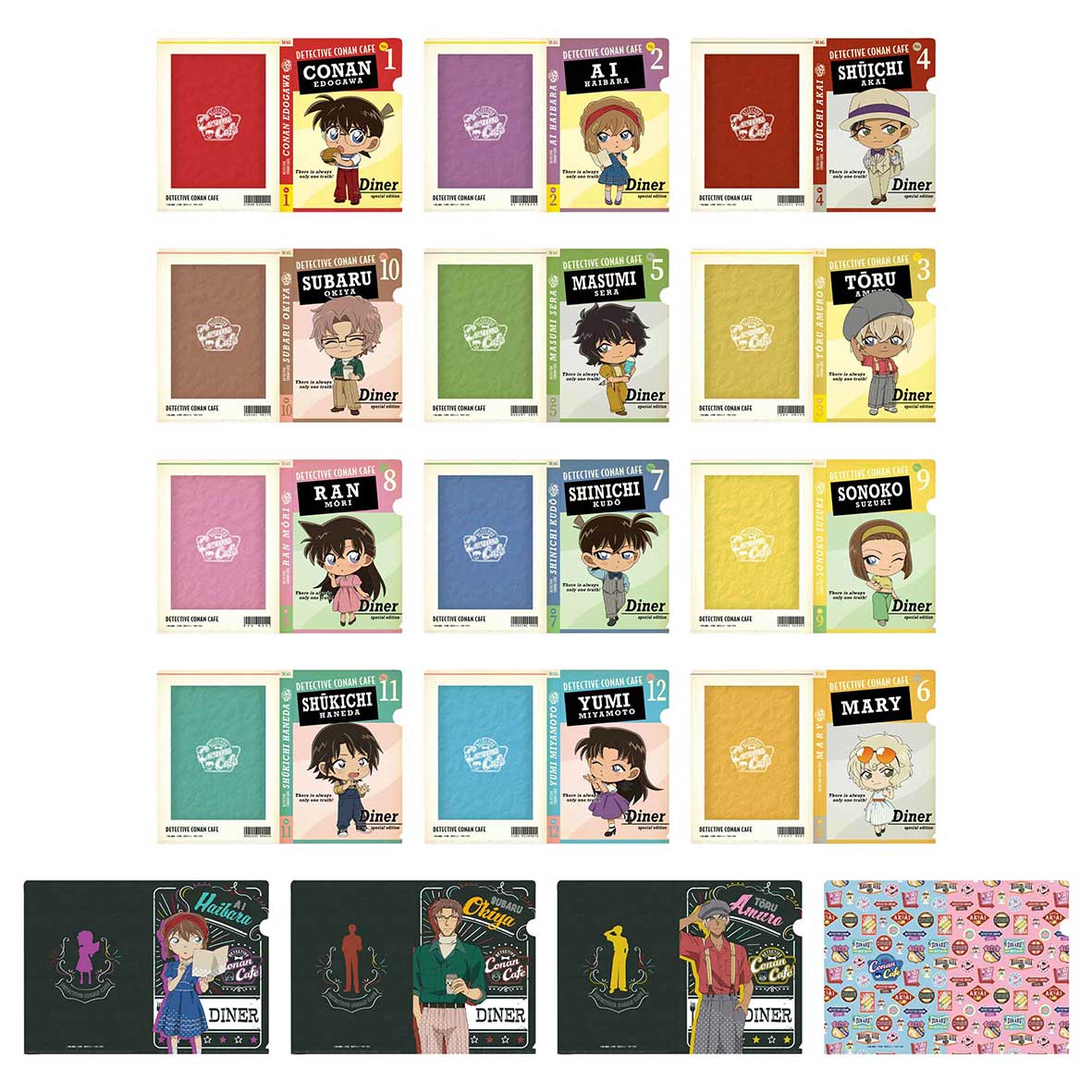 ダイナーで提供されるフードとミニキャラをあしらったデザインと、「江戸川コナン」「赤井秀一」「世良真純」のスリーショットデザインの2種がラインナップされています。